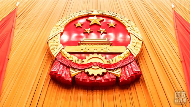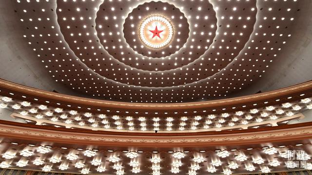 △人民大會(huì)堂內(nèi),國徽高懸。